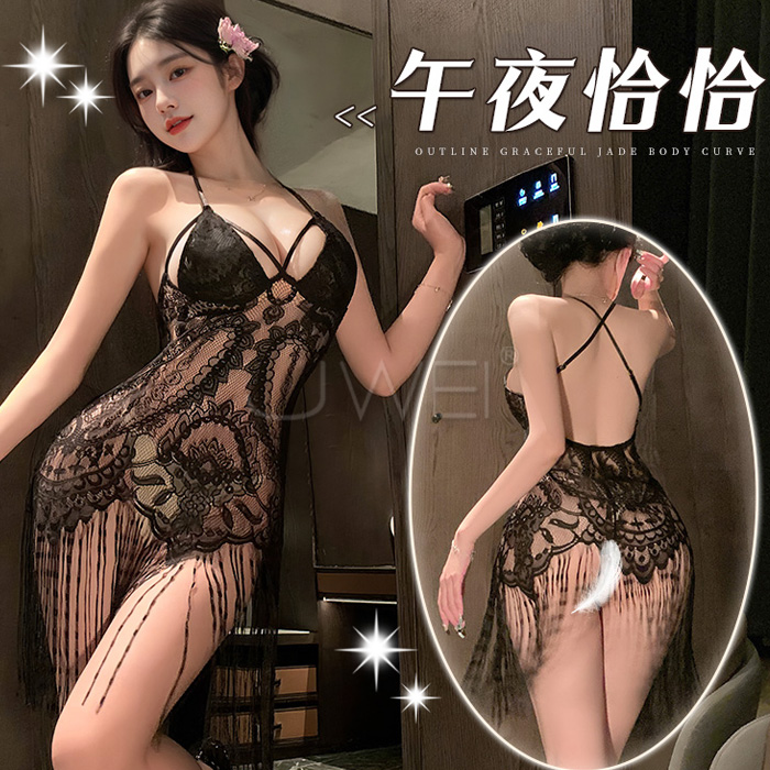 | 黑蕾桃桃.法式純欲私房蕾絲花蔓透視雪紡睡裙 【睡裙+T褲】