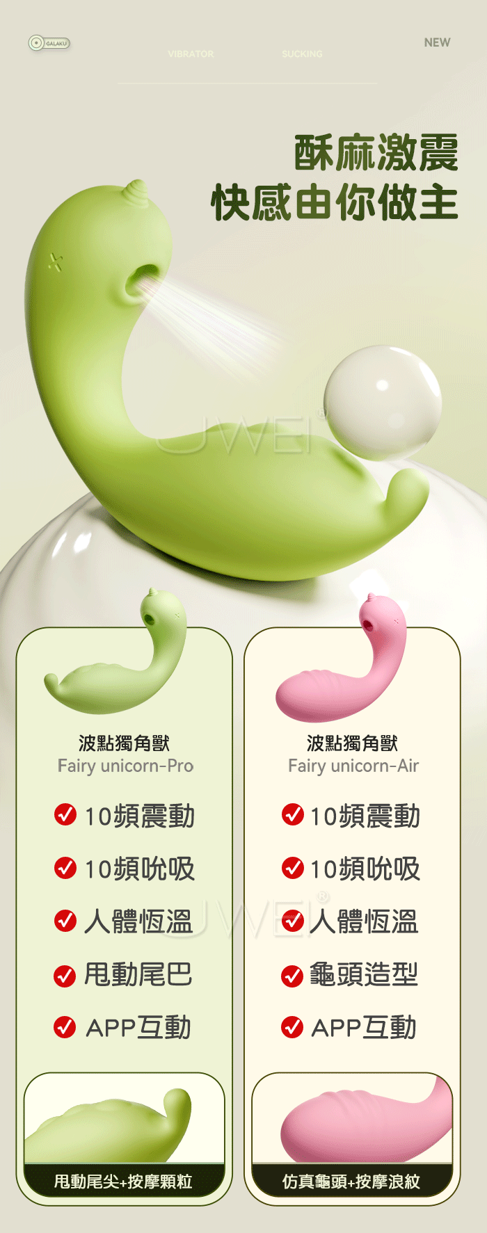 GALAKU 精靈系列~可愛設計,帶來愉悅的使用體驗,讓每次使用都充滿驚喜。 獨角獸萌蛋,獨特造型,既迷人又實用。撩震挑撥,尾尖甩動G點。 10頻酥震口吸,10種模式邊吸邊震,帶來強烈的刺激感,滿足各種需求。 產品規格 ■尺寸:大小詳如圖片標示 ■重量:如圖片標示 ■材質:TPE+AES ■功能:10頻震動、10頻吮吸、加溫、APP遠控