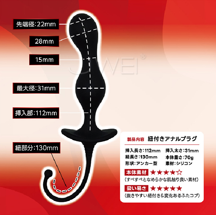 テールの紐でスムーズに引き抜ける使いやすいアナルプラグ!