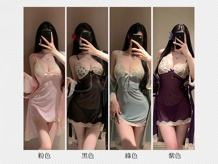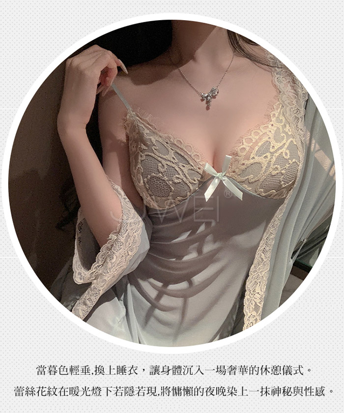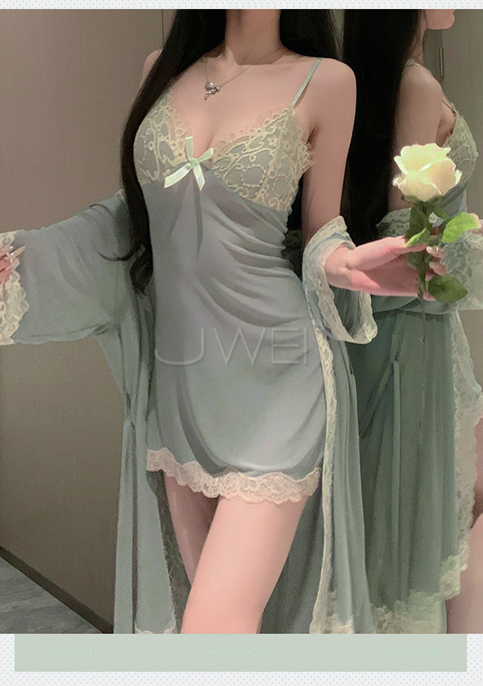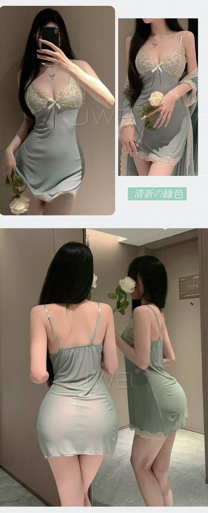 | 微醺蕾絲.性感深V露溝睫毛蕾絲覆胸美背睡裙-綠色【外袍+睡裙+T褲】