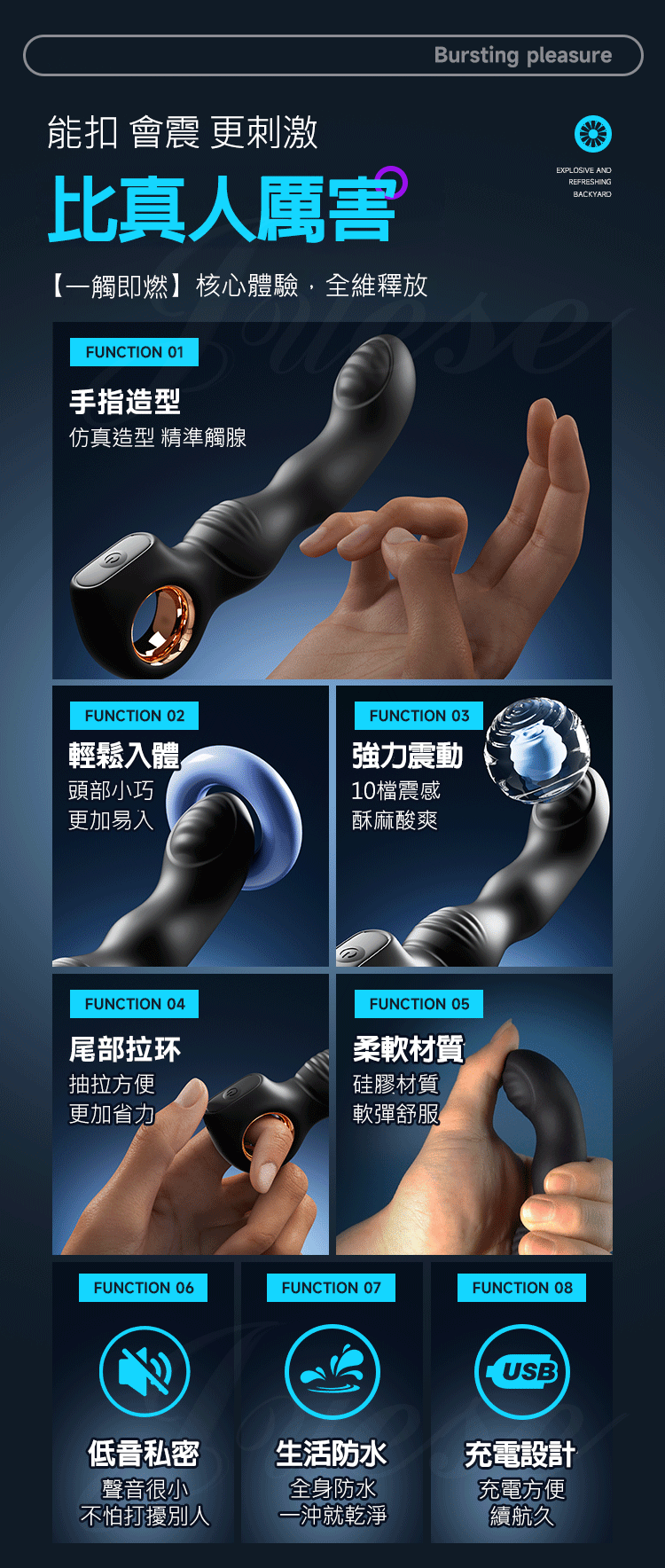 多點刺激│直達高潮,精準仿生指型,尾部猛然扯動,括約肌猛烈收縮。